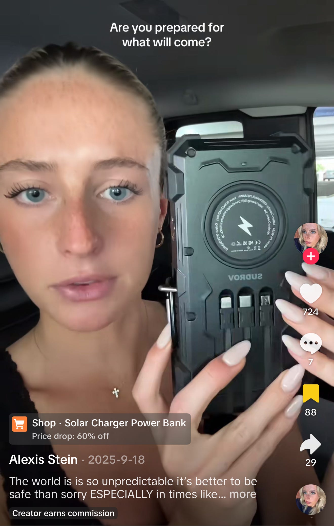 Other ads are less subtle. I swipe and see another placement for a similar gas mask, but this time the influencer-merchant voice-over is forthcoming enough to use the words ‘civil war’ without fear of TikTok algorithmic suppression. Another swipe and my final influencer-merchant, who seems cast from a Bama Rush pledge, sits in her car, orating her sales pitch in a perfect ‘Problem → Solution’ narrative arc to her front-facing camera. Her ring light winks at me through the reflection of her irises: